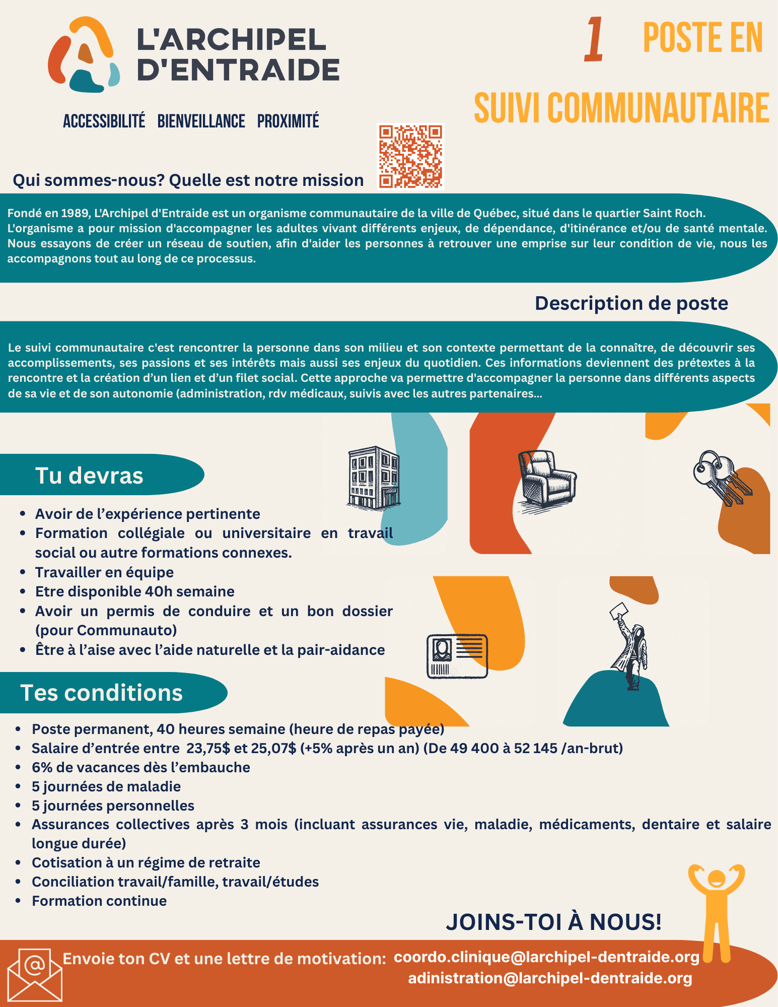 Le suivi communautaire c’est rencontrer la personne dans son milieu et dans son contexte permettant de la connaître, de découvrir ses accomplissements, ses passions et ses intérêts mais aussi ses enjeux du quotidien. Ces informations deviennent des prétextes à la rencontre et à la création d’un lien et d’un filet social. Cette approche va permettre d’accompagner la personne dans différents aspects de sa vie et de son autonomie (administration, rdv médicaux, suivis avec les autres partenaires…)